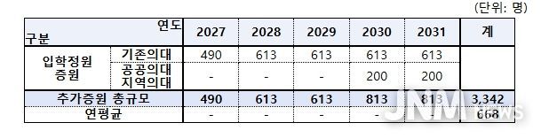 이와 함께 2027년의 경우 기존의대는 증원규모의 80% 규모(490명)를 증원하도록 해서 증원 초기 의대교육 현장의 부담을 완화할 수 있도록 했다.