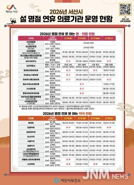 한편, 설 연휴 기간 문 여는 의료기관에 대한 정보는 서산시보건소 누리집, 응급의료정보센터, ‘응급똑똑’ 모바일 앱 등에서 확인할 수 있다.