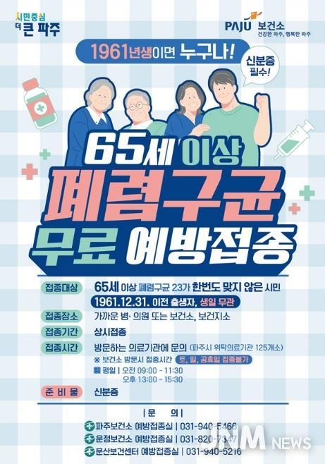 제이앤엠뉴스 | 파주시는 고령층의 건강한 노후와 감염병 예방을 위해 65세 이상 시민을 대상으로 폐렴구균 예방접종을 연중 무료로 지원하고 있다고 밝혔다.
