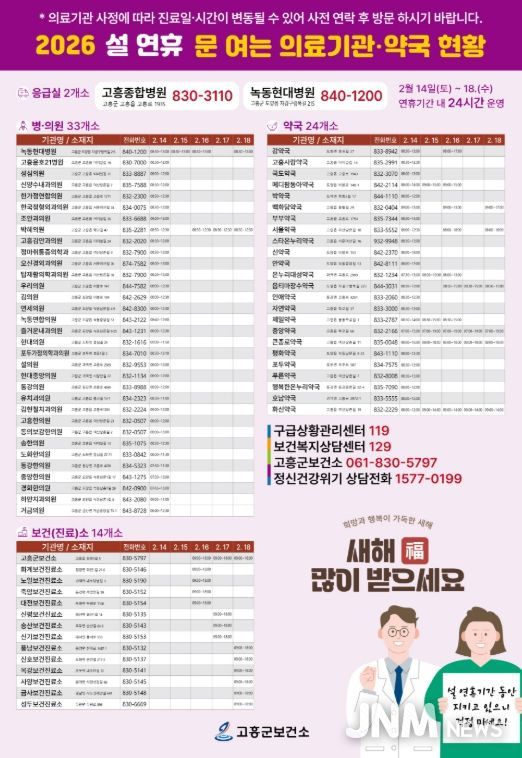 한편, 설 연휴 기간 진료가 가능한 의료기관과 약국 정보는 고흥군보건소 누리집이나 응급의료포털에서 확인할 수 있으며, 고흥군 보건소로 문의하면 자세히 안내받을 수 있다.