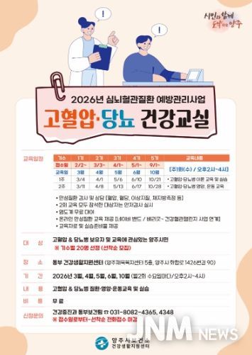 제이앤엠뉴스 | 양주시보건소 동부 건강생활지원센터에서는 시민의 심뇌혈관질환 예방과 만성질환 관리를 위해 '2026년 고혈압·당뇨병 건강교실'을 운영한다.