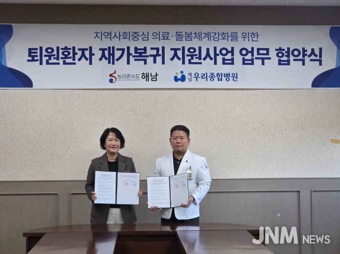 해남군과 해남종합병원(원장 김동국), 해남우리종합병원(원장 김옥민)은 지난 6일‘퇴원 환자 재가 복귀 지원을 위한 업무 협약’을 체결했다. 이번 협약은 전문 의료 사회복지사가 상주하는 지역 의료기관과 협력해 퇴원 직후 발생할 수 있는‘돌봄 공백’을 메우기 위해 마련됐다.
