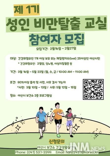 제이앤엠뉴스 | 아산시 보건소는 2월 16일부터 2월 27일까지 성인을 대상으로 비만 예방과 건강 증진을 위한 ‘성인비만탈출교실’ 참여자를 모집한다.