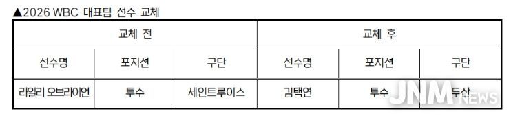 제이앤엠뉴스 | KBO 전력강화위원회는 부상으로 인해 WBC 참가가 어려워진 세인트루이스 라일리 오브라이언을 대체할 선수로 두산 김택연을 확정하고 WBC 조직위에 선수 교체 승인을 요청했다.