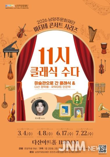 한편, 2026 남양주문화재단 마티네 콘서트는 초등학생 이상 관람 가능하며, 공연별 티켓 오픈 일정 및 자세한 내용은 남양주문화재단과 남양주시 누리집을 통해 확인할 수 있다.