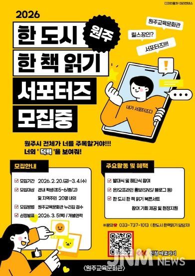 제이앤엠뉴스 | 강원특별자치도교육청원주교육문화관은 지역 독서 문화 확산과 시민 참여 확대를 위해 ‘2026년 원주 한 도시 한 책 읽기 서포터즈’를 운영한다.