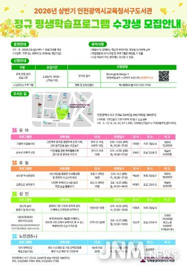 제이앤엠뉴스 | 인천광역시교육청서구도서관은 주민의 배움과 성장을 지원하기 위해, 오는 26일부터 상반기 정규 평생학습프로그램 학습자를 모집한다.