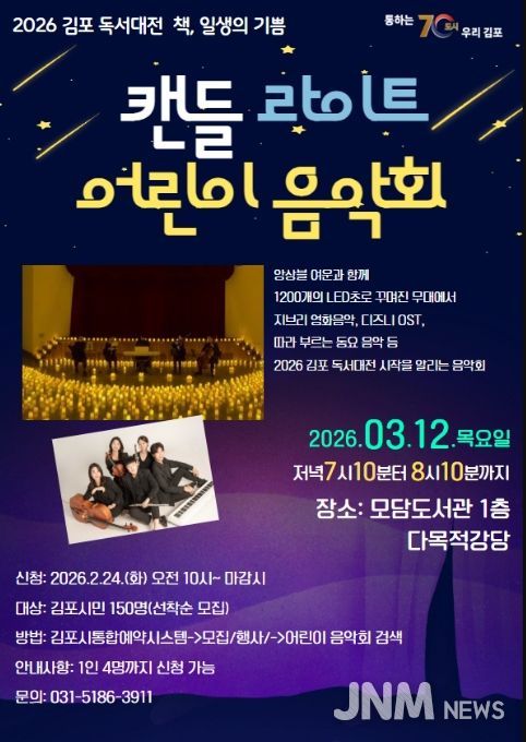 제이앤엠뉴스 | 김포시 도서관은 2026 김포 독서대전의 시작을 알리는 공연으로 '캔들 라이트 어린이 음악회'를 2026년 3월 12일 19시 10분부터 20시 10분까지 모담도서관 1층 다목적강당에서 진행한다.