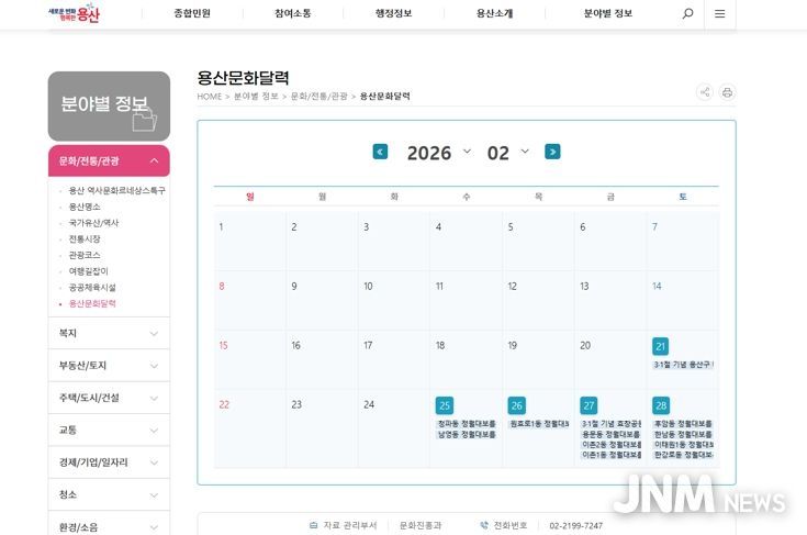 제이앤엠뉴스 | 서울 용산구는 용산구와 용산문화원, 용산역사박물관 등 유관 기관이 운영하는 다양한 문화행사 정보를 한눈에 확인할 수 있는 온라인 기반 ‘용산문화달력’을 구축하고, 2월부터 정식 운영한다고 밝혔다.