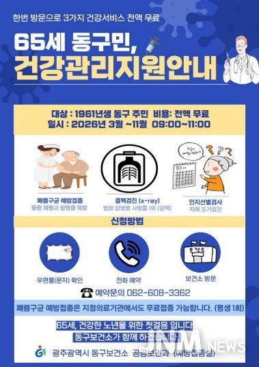제이앤엠뉴스 | 광주 동구는 올해 65세에 진입하는 1961년생 주민을 대상으로, 예방접종과 주요 검진을 한 번에 받을 수 있는 ‘65세 통합 건강점검’ 사업을 3월부터 본격 시행한다고 밝혔다.