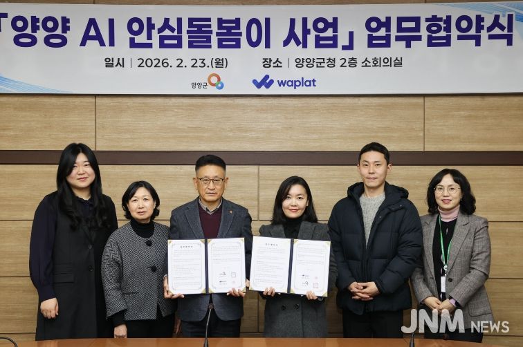 제이앤엠뉴스 | 양양군은 23일 오전 군청 소회의실에서 와플랫 주식회사(대표 황선영)와 ‘양양 AI 안심 돌봄이 사업’ 추진을 위한 업무협약(MOU)을 체결했다고 밝혔다.