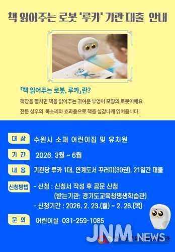제이앤엠뉴스 | 경기도교육청평생학습관이 수원시 소재 어린이집과 유치원을 대상으로 책 읽어주는 로봇 ‘루카(Luka)’와 ‘연계도서 꾸러미’ 대출 서비스를 운영한다.