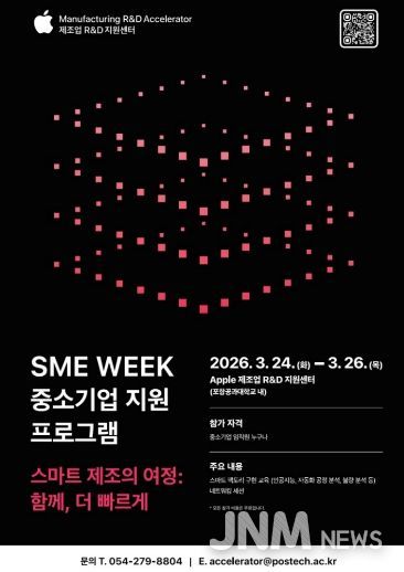 제이앤엠뉴스 | 경상북도와 함께 제조 혁신을 추진하고 있는 애플 제조업 R·D 지원센터(포항공과대학교 내)는 오는 3월 24일부터 26일까지 3일간 중소 제조기업을 대상으로 ‘SME Week 중소기업 지원 프로그램’을 개최한다.