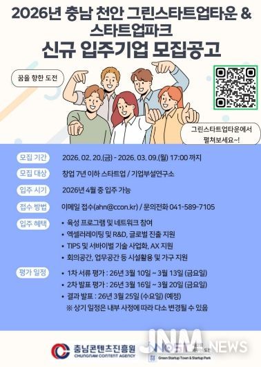제이앤엠뉴스 | 충남콘텐츠진흥원은 오는 26년 3월 9일까지 ‘충남 천안 복합형 스타트업 파크’에 입주할 신규 스타트업을 모집한다고 밝혔다.