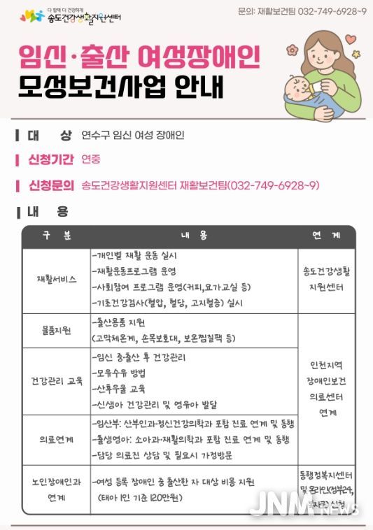 제이앤엠뉴스 | 연수구 송도건강생활지원센터는 지역 내 임신·출산 여성장애인을 대상으로 재활부터 의료기관 연계까지 다양한 모성보건 서비스를 제공한다.