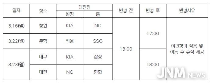 제이앤엠뉴스 | 2026 KBO 시범경기 중 일부 경기의 개시 시간이 야간경기 적응 및 이동 후 휴식 제공을 위해 변경됐다.