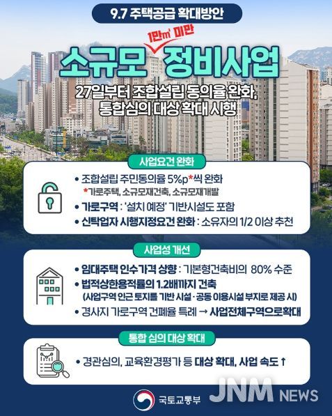 제이앤엠뉴스 | 소규모 정비사업의 조합설립 동의율이 27일부터 5%포인트 낮아진다.