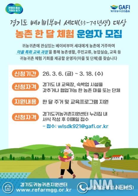 제이앤엠뉴스 | 경기도와 경기도농수산진흥원이 베이비부머 세대를 위한 농촌 한 달 체험 프로그램을 운영할 마을과 단체 2곳을 18일까지 모집한다.