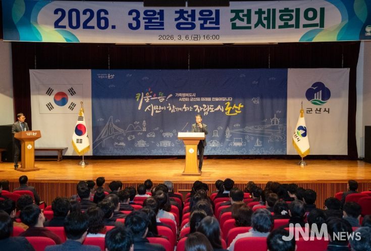 군산시는 6일 오후 시청 대강당에서 560여 명의 직원이 참석한 가운데 청원 전체회의를 열었다고 밝혔다. 이번 회의는 강임준 군산시장이 지난 2월 27일 '제9회 전국동시지방선거' 예비후보 등록으로 직무가 정지된 이후, 시정의 안정적 운영과 주요 현안의 원활한 추진을 위해 마련됐다.