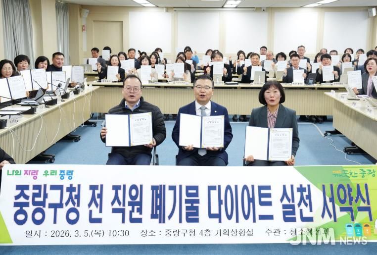 중랑구는 수도권 생활폐기물 직매립 금지 정책 시행에 맞춰 지난 5일 직원들과 함께 '폐기물 다이어트 실천 서약식'을 열었다. 이 자리에는 구청장과 각 부서장이 참석해 음식물, 비닐·플라스틱, 종이 분리배출, 다회용기 사용, 외출 시 장바구니·텀블러 사용 등 다섯 가지 실천 항목을 약속했다.