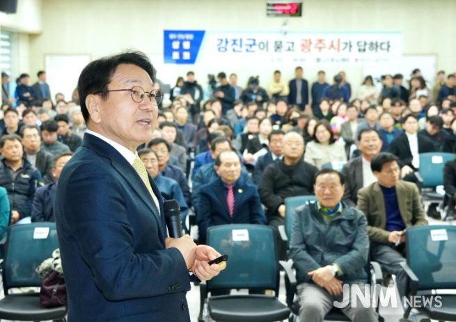 광주광역시는 10일 강진군에서 '광주·전남 통합 강진군 상생토크'를 개최해, 통합 이후 강진의 발전 방향과 협력 방안에 대해 군민들과 의견을 교환했다. 이 행사에는 강기정 광주시장, 강진원 강진군수, 군민 등 200여 명이 참석했다.