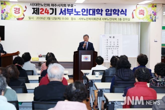 제이앤엠뉴스 | 김완근 제주시장이 3월 12일 서부노인복지회관에서 열린 제주시서부노인대학 제24기 입학식에 참석해 축하 인사를 전했다.