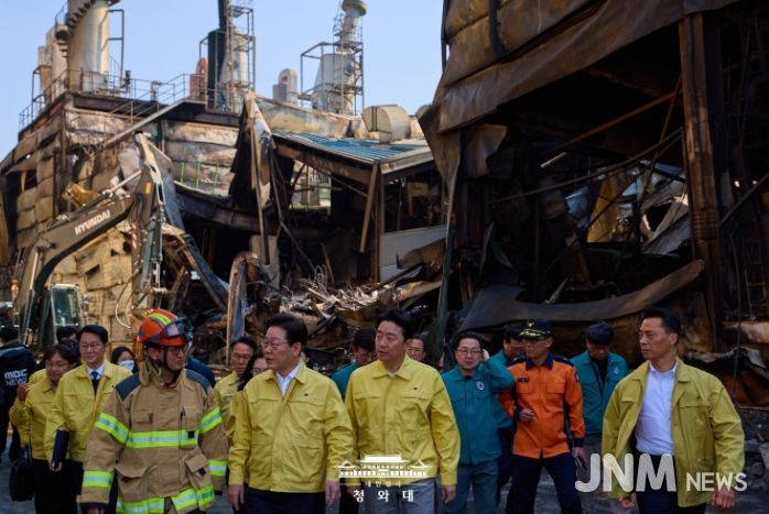 제이앤엠뉴스 | 이재명 대통령이 21일 오후 대전 대덕구에서 발생한 안전공업 화재 현장을 방문해 피해 상황을 확인하고 구조 활동을 점검했다.