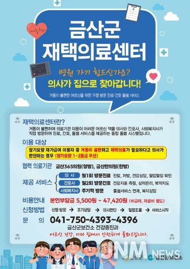 금산군보건소 관계자는 "거동이 불편해 병원 이용이 어려운 어르신들이 집에서도 필요한 의료서비스를 받을 수 있도록 재택의료센터 프로그램을 진행할 것"이라며, "읍면 행정복지센터와 긴밀히 협력해 대상자를 적극 발굴함으로써 통합돌봄지원법 시행에 맞춰 지역 중심 돌봄체계를 안정적으로 운영해 나가겠다"고 밝혔다.