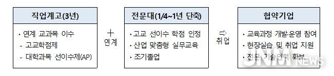전문대학은 직업계고와 기업과 함께 전공과목을 분석해 교육과정의 연계성을 강화한다. 대학에서 기존 고교 과목이 대학 과목과 유사하다고 판단되면 학점 이수를 인정하고, 학점 인정이 어려운 고교 과목은 새롭게 구성한다. 또, 직업계고 학생을 위한 대학과목 선이수(AP) 과목도 개설할 수 있다.