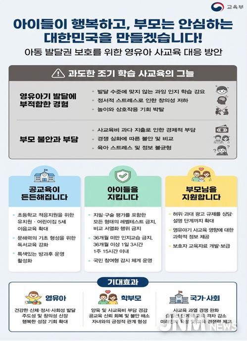 제이앤엠뉴스 | 교육부가 4월 1일 영유아 사교육 시장의 과도한 확장과 조기 경쟁 문제에 대응하기 위한 새로운 대책을 내놓았다. 이번 대책은 아동의 발달권 보장과 사교육 시장의 정상화를 목표로 하고 있다.