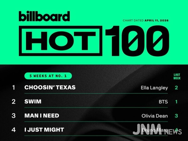 제이앤엠뉴스 | 방탄소년단(BTS)이 'SWIM'으로 빌보드 HOT 100에서 2주 연속 상위권을 기록했다.