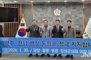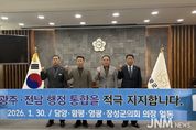 제이앤엠뉴스 | 담양군의회가 인구 소멸 위기 극복과 지역 경쟁력 강화를 위해 인근 의회와 손을 맞잡고 광주-전남 행정통합 추진에 힘을 보탰다. 담양·함평·영광·장성군 의장단은 ‘광주-전남 행정통합 염원 공동 퍼포먼스’를 펼치며, 행정구역의 경계를 넘어선 초광역 협력 체계 구축에 대한 강력한 의지를 표명했다. 이번 퍼포먼스는 단순한 선언을 넘어, 광주와 전남이 하나의 생활권이자 경제권으로 재편되어야만 수도권 집중화에 대응하고 자생적인 발전 동력을 얻을 수 있다는 절박한 공감대 속에서 마련됐다. 참석한 의장단은 성명을 통해 “행정통합은 지역의 미래 경쟁력 확보와 균형발전을 위해 더 이상 미룰 수 없는 시대적 소명”이라며, “지금이야말로 광주와 전남의 백년대계를 결정할 골든타임”이라고 강조했다. 특히 장명영 의장은 “담양은 광주와 인접한 지리적 이점과 생태문화 자원을 동시에 갖춘 지역으로, 행정통합 시 시너지 효과가 가장 클 것으로 기대되는 곳”이라며, “통합 과정에서 군민의 목소리가 소외되지 않고 실질적인 복지 증진과 지역 발전으로 이어질 수 있도록 정책적 역할을 다하겠다”고 말했다. 한편